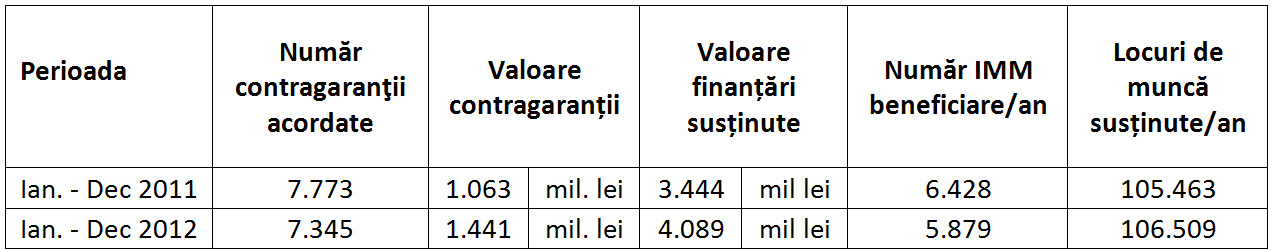Valoric, contragarantiile acordate in anul 2012, indica o creștere cu 36% comparativ cu anul 2011, in timp ce numeric s-a inregistrat o scadere cu 6%. Situatia este o consecinta a tendintei manifestate pe piata bancara incepand cu 2011, de concentrare a datoriei pe un numar redus de IMM, ceea ce poate reflecta o activitate intensa de reașezare a portofoliilor bancare.
