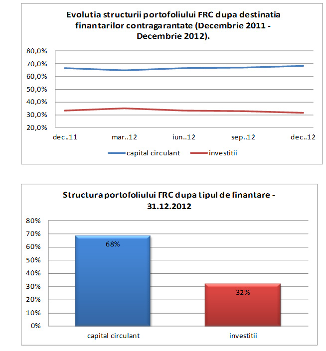 La 31.12.2012, contragarantiile destinate capitalului circulant reprezinta 68% din totalul portofoliului FRC, cu mentiunea ca acestea includ atat contragarantii aferente unor finantari cu maturitate sub un an (cea mai mare parte), dar si contragarantii asociate unor finantari pe termen mediu si chiar si lung.