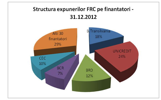 9. Structura pe finantatori a portofoliului FRC la 31.12.2012 Graficul reflecta gradul de institutionalizare a mecanismului de garantare/contragarantare realizat cu participarea unui numar de 35 de institutii finantatoare care au acordat IMM finantari garantate de fondurile de garantare si contragarantate de FRC. Principalele banci participante in cadrul acestui mecanism sunt: Banca Transilvania, UNICREDIT, BRD, BCR si CEC. Conform situatiei expunerilor la 31.12.2012, cele cinci banci cumuleaza cca. 71% din volumul acestora si respectiv 80% din numarul lor total.